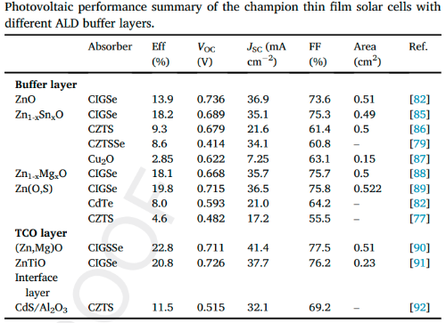 ALD在薄膜太陽能電池上的應(yīng)用主要是由對納米層沉積和界面改性的要求驅(qū)動的,按功能層可將其分為吸收層,緩沖層,界面鈍化層和透明導(dǎo)電氧化物層等。金屬氧化物在有機(jī)、鈣鈦礦及硅/鈣鈦礦疊層等高效電池的制備中也有廣泛的應(yīng)用。無論是作為電子/空穴傳輸層、復(fù)合層還是封裝層,ALD一直扮演著至關(guān)重要的角色。