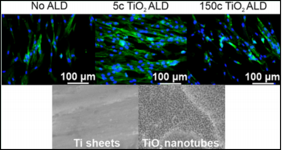 圖2:Thin TiO2 Coatings by ALD Enhance the Cell Growth on TiO2 Nanotubular and Flat Substrates
