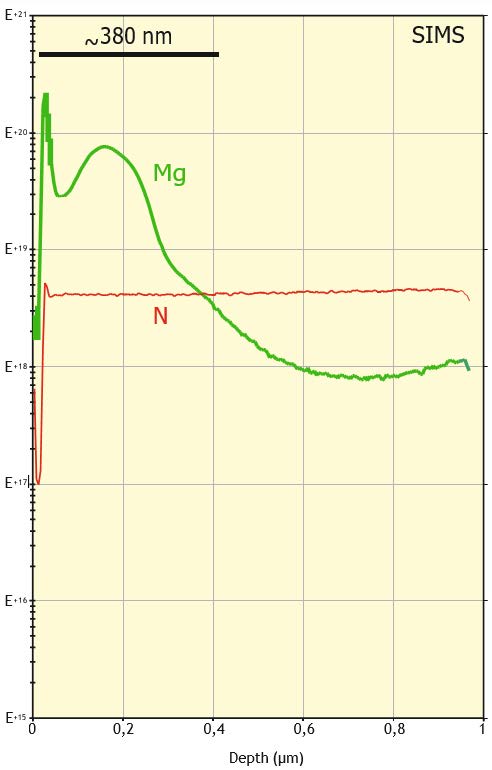 圖二:在同一植入樣品上獲得SIMS剖面。CL檢測到的缺陷區(qū)域深度與SIMS剖面檢測到的深度相匹配。
