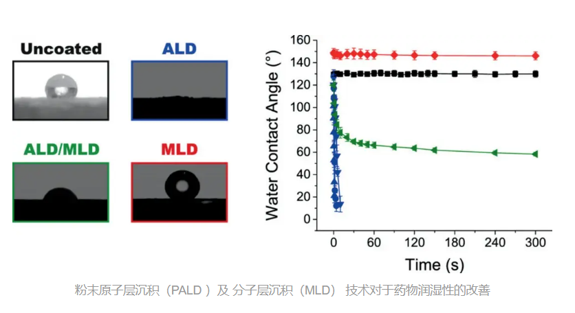 制藥?業(yè)依賴于對活性藥物成分 (API) 以及各種輔藥在內(nèi)的藥物粉末進?加?。藥物粉末被加?成?囊,?劑、丸劑、吸?劑或眼科治療劑(滴眼液)。由于藥粉多為有機固體,其流動性、潤濕性、壓實性和分散性較差,精確劑量的藥粉制造?藝既昂貴?耗時。通過粉末原子層沉積 PALD 技術(shù)可以改善粉末的流動性、壓實性和顆粒分散性。