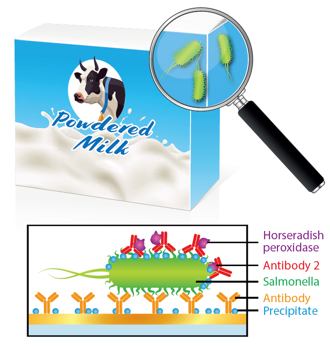圖2。沙門氏菌的檢測是基于抗體(HRP-Ab2)與細(xì)菌的結(jié)合和辣根過氧化物酶的生物催化沉淀。幾個HRP-Ab2結(jié)合在一個細(xì)菌上導(dǎo)致信號呈指數(shù)級擴(kuò)增。