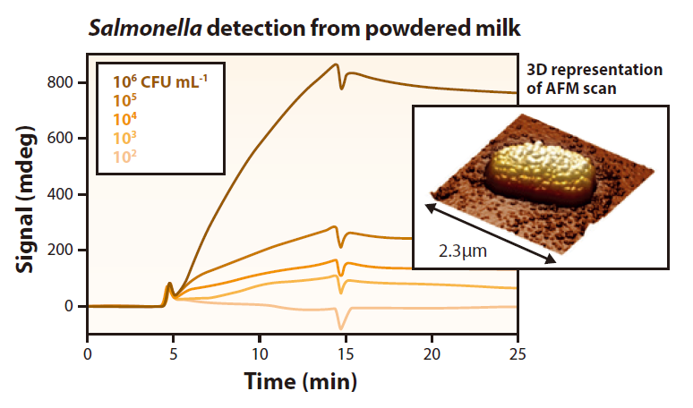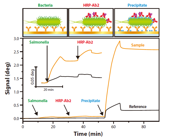 圖1所示。多參數(shù)表面等離子體共振(MP-SPR)檢測奶粉中沙門氏菌。辣根過氧化物酶抗體2 (HRP-Ab2)特異性結(jié)合沙門氏菌和沉淀物的形成。