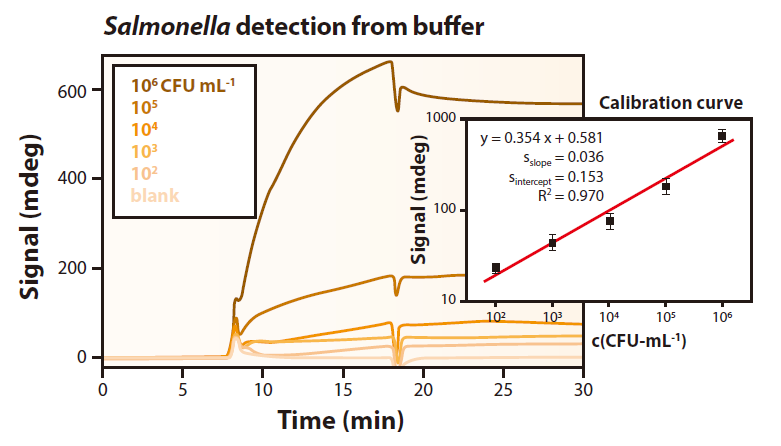 該生物傳感器首先在Biacore 3000 SPR儀器上開發(fā),LOD達(dá)到104 CFU/mL。為了進(jìn)一步改進(jìn)生物傳感器,選擇了生物催化沉淀反應(yīng)來提高靈敏度。然而,辣根過氧化物酶需要使用乙醇。Biacore儀器與醇不兼容,不像BioNavis MP-SPR儀器,它對有機(jī)溶劑具有優(yōu)異的抵抗力。因此,選擇MP-SPR Navi?210A VASA進(jìn)行進(jìn)一步研究。