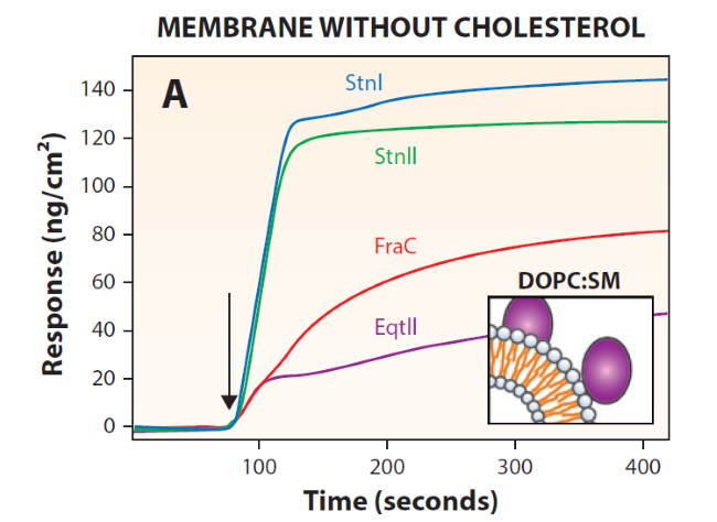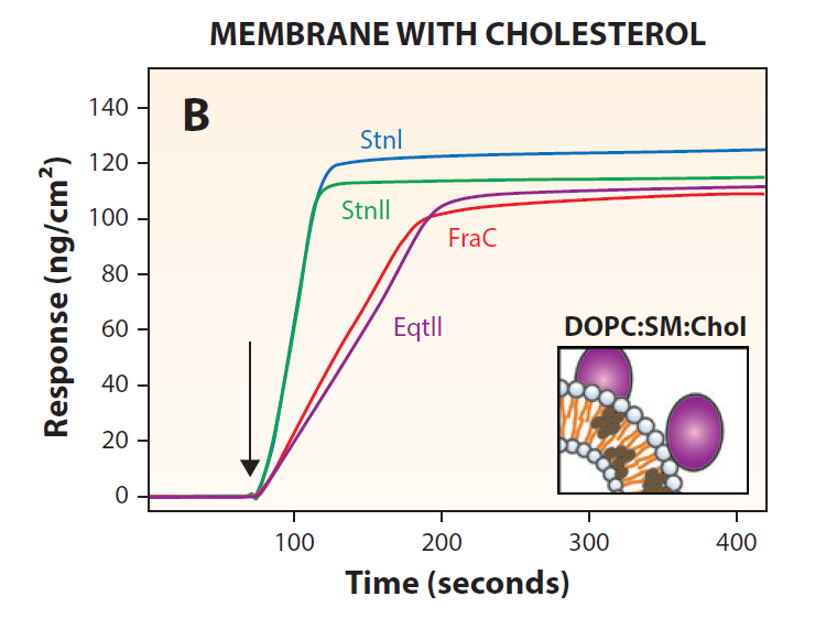 研究了三種??a(chǎn)生的Equinatoxin II (EqtII)、fragaceatoxin C (FraC)、sticholysins I和II (StnI和StnII)(圖1)。4.0 μM放線素作用于脂質(zhì)表面10分鐘,計算結(jié)合質(zhì)量(ng/cm2)。利用CHAPS對傳感器表面進行再生。