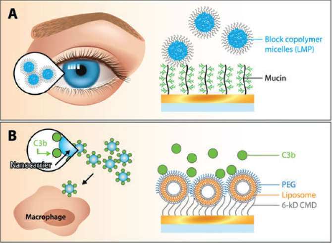 圖1所示。(A)多參數(shù)表面等離子體共振(MP-SPR)測(cè)量納米顆粒與表面固定化分子的結(jié)合:研究了嵌段共聚物膠束(LMP)與黏液表面的結(jié)合,用于黏液黏附眼部給藥。(B)分子與表面附著納米顆粒的結(jié)合:研究了調(diào)理劑C3b與改性脂質(zhì)體基納米顆粒的結(jié)合,以評(píng)估納米載體的免疫反應(yīng)。