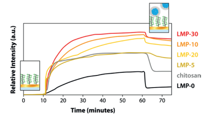 圖2所示:測(cè)定了不同苯基硼酸(PBA)含量(LMP-0、-5、-10、-20和-30)的嵌段共聚物膠束與粘蛋白的結(jié)合。膠束的黏附力隨PBA含量的增加而增加,并在LMP-10后達(dá)到平穩(wěn)期。以殼聚糖與粘蛋白結(jié)合為陽(yáng)性對(duì)照。在MP-SPR固定角度模式下進(jìn)行測(cè)量。