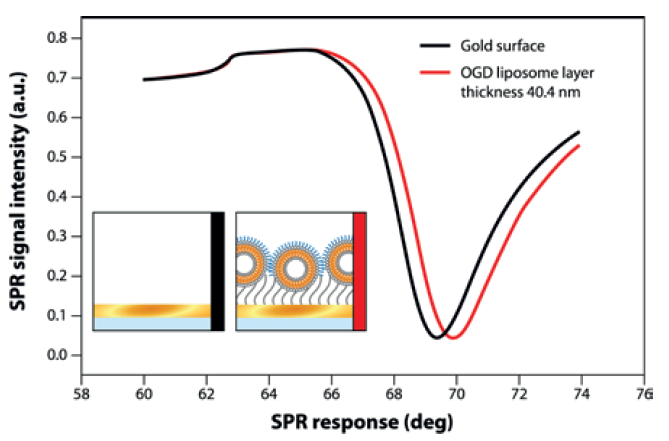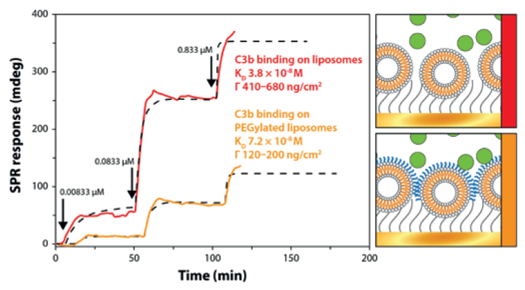 在另一項(xiàng)研究中,使用MP-SPR測(cè)量了C3b分子與脂質(zhì)體的結(jié)合。C3b是先天免疫系統(tǒng)的一部分,它作為一種調(diào)理劑增強(qiáng)吞噬作用(更具體地說,標(biāo)記細(xì)胞進(jìn)行吞噬)。C3b對(duì)聚乙二醇化寡聚胍脂質(zhì)修飾(OGP + PEG)脂質(zhì)體的親和力為KD = 7.2 × 10?8 M,表面質(zhì)量密度Γ = 120 ~ 200 ng/cm2。不含PEG的脂質(zhì)體上的結(jié)合水平較高。