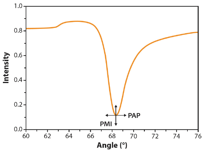 圖1:MP-SPR儀器可以連續(xù)測量全SPR曲線,并可以實時跟蹤多個參數(shù),包括峰值角位置信號(PAP)和峰值最小強度(PMI)。