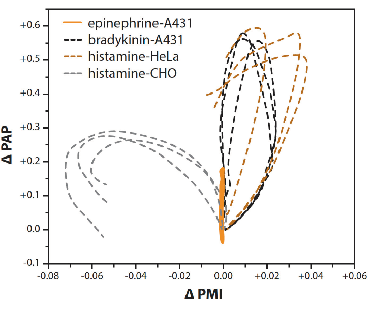 圖4:雙參數(shù)PMI-PAP反應(yīng)譜,其中PAP(峰值角位置)反應(yīng)與PMI(峰值最小強度)反應(yīng)相對應(yīng),顯示不同激動劑和細胞系的明確可區(qū)分模式。