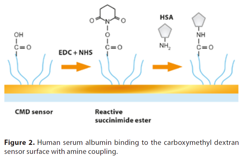 羧基甲基葡聚糖(CMD)包被的傳感器載玻片通過胺偶聯(lián)化學(xué)固定HSA(圖2)。固定在21°C下進行,使用5 mM MES (2-(N-morpholino)乙磺酸)pH 5.0作為運行緩沖液。表面用EDC/NHS活化,用5mM乙醇胺(pH 8.0)滅活。