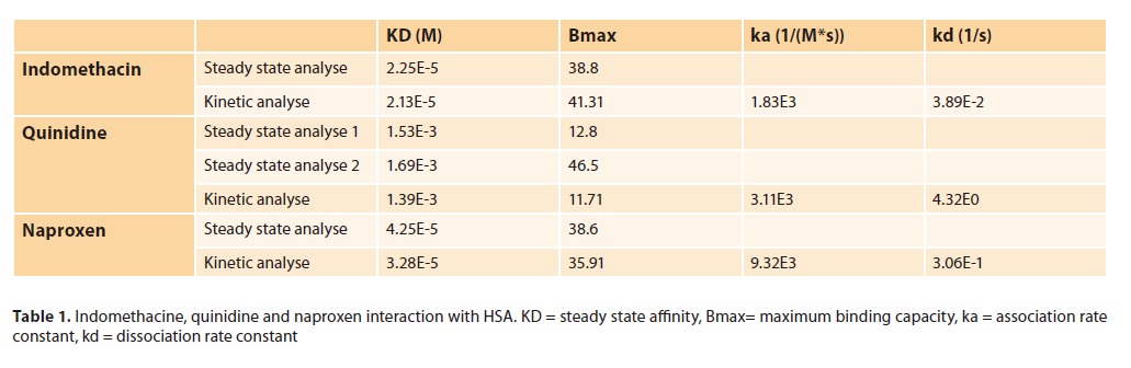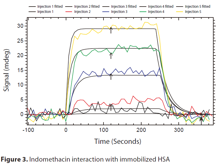 采用SPR Navi 220A型儀器測定小分子藥物吲哚美辛、奎尼丁和萘普生(357.8、324.4和230.3 g/mol)與固定化HSA的相互作用。實驗采用pH為7.4的PBS(磷酸鹽緩沖鹽水)作為運行緩沖液,溫度為21℃。測量5個樣品濃度系列(0.1 ~ 50 μM)??岫∈禽^弱的結(jié)合劑,因此測定了較高的濃度(10 ~ 500 μM)。樣品中含有3%的二甲基亞砜(DMSO),以提高藥物的溶解度。用TraceDrawer分析了反應(yīng)的動力學(xué)和親和性。
