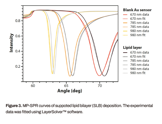 基于脂質(zhì)的傳感器表面在原位生成,并用專用的LayerSolver?軟件表征層的形成。SLB膜的厚度為5.65 nm, HBM層的厚度為1.95 nm下層的烷硫醇SAM,實(shí)際脂質(zhì)亞層的厚度為2.88 nm。三種激光波長(zhǎng)下SLB沉積的MP-SPR曲線及擬合如圖3所示。與聚乙二醇化的SAM表面相比,SLB和HBM表現(xiàn)出更好的細(xì)胞檢測(cè)靈敏度和更高的特異性細(xì)胞捕獲水平。