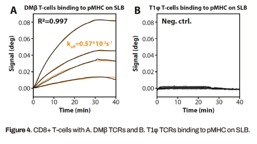 評(píng)估t細(xì)胞對(duì)腫瘤相關(guān)抗原的特異性對(duì)于開(kāi)發(fā)針對(duì)癌癥的個(gè)性化免疫療法至關(guān)重要。應(yīng)用多參數(shù)表面等離子體共振(MP-SPR)技術(shù)表征腫瘤特異性CD8+ t細(xì)胞中t細(xì)胞受體(TCR)的相互作用。完整的活細(xì)胞被捕獲到由肽-主要組織相容性復(fù)合物(pMHC)功能化的人造細(xì)胞膜組成的仿生表面上。在4個(gè)不同的t細(xì)胞群體中完成了TCR和pMHC之間免疫突觸形成的實(shí)時(shí)親和分析。