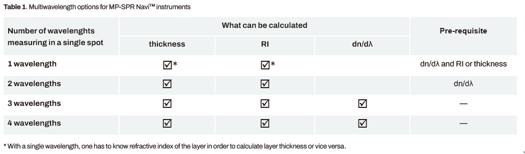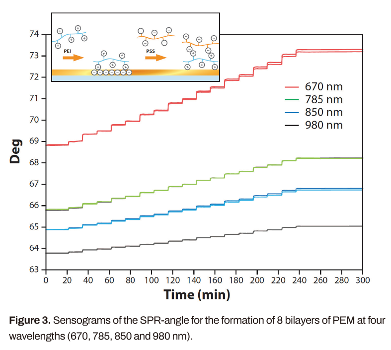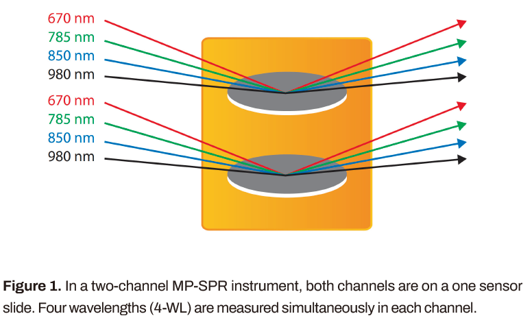 MP-SPR儀器用多個(gè)波長的光測(cè)量完整的SPR曲線,從而表征層的獨(dú)特厚度、折射率和色散值,如圖所示。定制的儀器可以在每個(gè)通道中配備多達(dá)四個(gè)波長,為層表征提供新的見解。使用相同的儀器設(shè)置,還可以測(cè)量與層的實(shí)時(shí)和無標(biāo)簽相互作用。