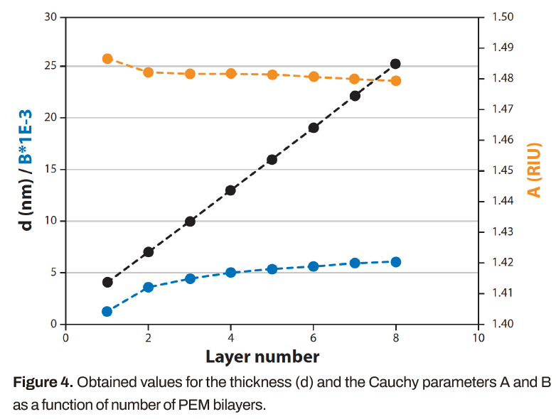 在角掃描模式下獲取SPR感測(cè)圖,以收集每個(gè)時(shí)間點(diǎn)的完整SPR曲線。測(cè)定每次注射PAH后的厚度和RI,得到每層PEM雙分子層(PSS+PAH)最多8層的角位移。使用LayerSolver?軟件(版本1.4)分析數(shù)據(jù),首先擬合空白傳感器,然后在每個(gè)雙層之后將層厚度設(shè)置為每個(gè)波長的全局參數(shù),并調(diào)用RI的柯西擬合模式(圖2)。請(qǐng)注意,常數(shù)a和b也將被設(shè)置為全局參數(shù),因?yàn)镽I現(xiàn)在是通過這些參數(shù)從波長導(dǎo)出的。