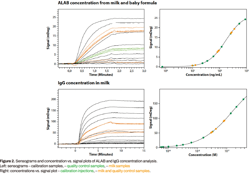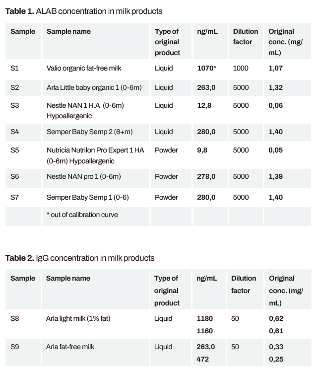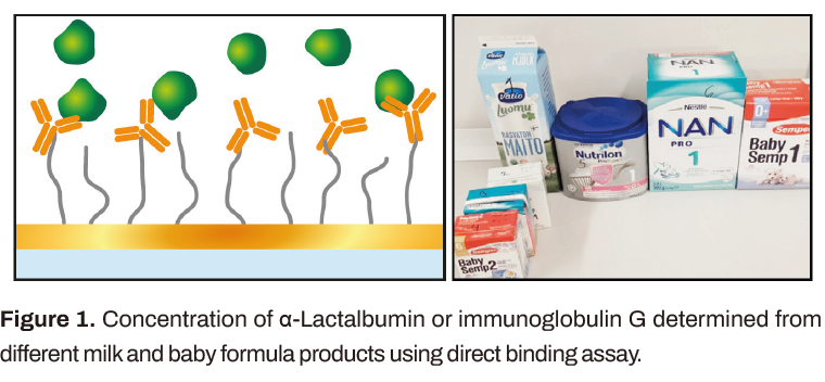 樣品是從芬蘭超市購買的不同的奶制品(圖1)。粉末樣品根據(jù)包裝上的說明制備成液體形式,并進一步稀釋1000或50倍(正常牛奶)和5000倍(嬰兒產品)。使用90秒的樣品注射(校準或牛奶樣品),120秒的等待時間和60秒的ALAB再生注射進行測量。IgG注射時間較長。ALAB的校準范圍為0 - 1000 ng/mL, IgG的校準范圍為0 - 75 000 ng/mL。校正曲線符合4參數(shù)Low-High方程,也可用于測定樣品中的蛋白質濃度。