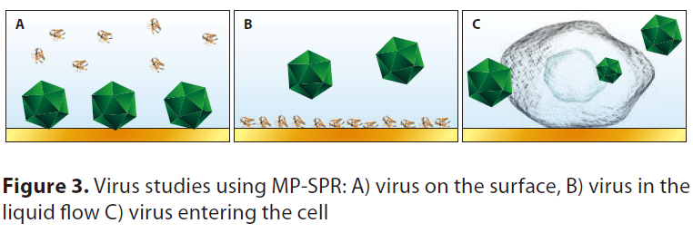 使用MP-SPR可以利用各種實驗裝置進行病毒相互作用測量。如圖3所示,病毒可以像這里描述的那樣附著在傳感器表面(作為配體)或中間所示,它們可以在液體流動中自由移動(作為分析物),而靶標在表面或細胞可以附著在傳感器表面。與此同時,病毒正在進入細胞,如圖所示。如利用MP-SPR技術(shù)研制玉米綠斑病毒(MCMV)檢測生物傳感器時,以病毒為分析物。
