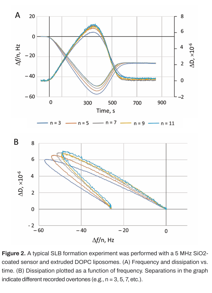這里,Δf是基頻變化,Δm是單位面積增加層的質(zhì)量,C是與石英性質(zhì)有關(guān)的所謂質(zhì)量靈敏度常數(shù)(對(duì)于5 MHz晶體,C = 17.7 ng/(cm2Hz))。圖2B給出了相同的數(shù)據(jù),繪制為耗散與頻率的關(guān)系(稱為Df圖)。頻移值與文獻(xiàn)報(bào)道的值一致,表明BioNavis QCMD系統(tǒng)可靠地記錄小耗散值并準(zhǔn)確地跟蹤其變化。圖2A所示的結(jié)果代表了SLB在不同泛音處形成的經(jīng)典特征,其中完整的脂質(zhì)體最初吸附,導(dǎo)致頻率和耗散的顯著變化,隨后轉(zhuǎn)化為具有最小耗散的平面雙層。
