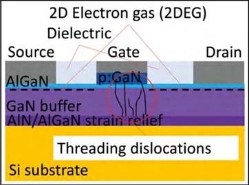 這是結(jié)型常關(guān) HEMT 的一般設(shè)計(jì),通常用于功率轉(zhuǎn)換應(yīng)用。整個(gè)樣品中均存在穿透位錯(cuò)。該草圖僅表明了它們的存在和方向,尤其是在結(jié)下方,在這里它們可能會(huì)產(chǎn)生最大的影響。