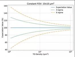 圖 2 . ( a ) 當(dāng) 在 單 個(gè)10×10μm2圖像中考慮恒定圖像區(qū)域(FOV)時(shí),變化的穿透位錯(cuò)密度的不確定性(表示為期望值的百分比)。(b )對(duì)于恒定的穿透位錯(cuò)密度為1×109 cm-2的不確定性(表示為期望值的百分比),針對(duì)具有變化的FOV的單個(gè)圖像進(jìn)行評(píng)估。