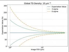 如圖 2 所示,當(dāng)使用較小的圖像確定穿透位錯(cuò)密度時(shí),更少的特征被展示 - 并且圖像更容易受到隨機(jī)統(tǒng)計(jì)波動(dòng)的影響。盡管單個(gè)圖像可以對(duì)穿透位錯(cuò)提供更精確檢測(cè),但在某些情況下,采樣誤差會(huì)覆蓋此增益,從而導(dǎo)致結(jié)果的準(zhǔn)確性較低。