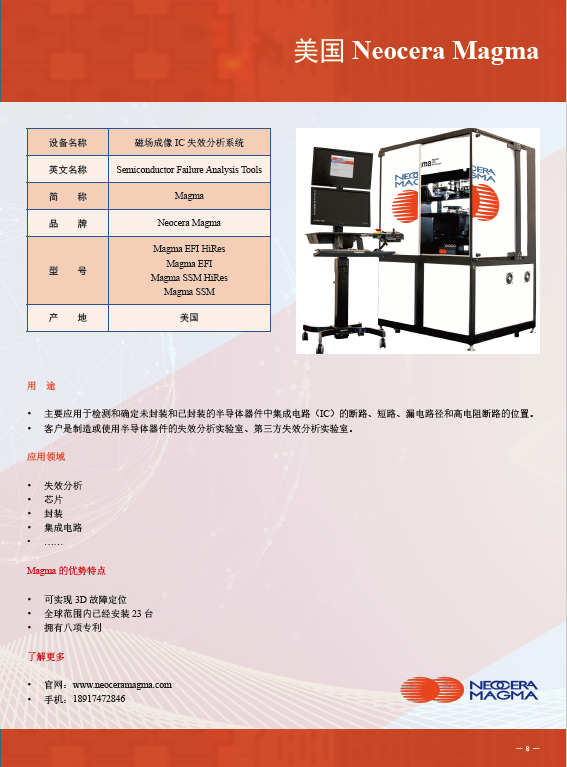 Neocera Magma是一家服務(wù)于半導(dǎo)體故障分析的技術(shù)公司,在故障分析設(shè)備研發(fā)方面處于領(lǐng)先地位。公司主要設(shè)備為磁場(chǎng)成像IC失效分析系統(tǒng),該設(shè)備擁有八項(xiàng)專利,主要應(yīng)用于檢測(cè)和確定未封裝和已封裝的半導(dǎo)體器件中集成電路(IC)的斷路、短路、漏電路徑和高電阻斷路的位置,可實(shí)現(xiàn)3D故障定位。