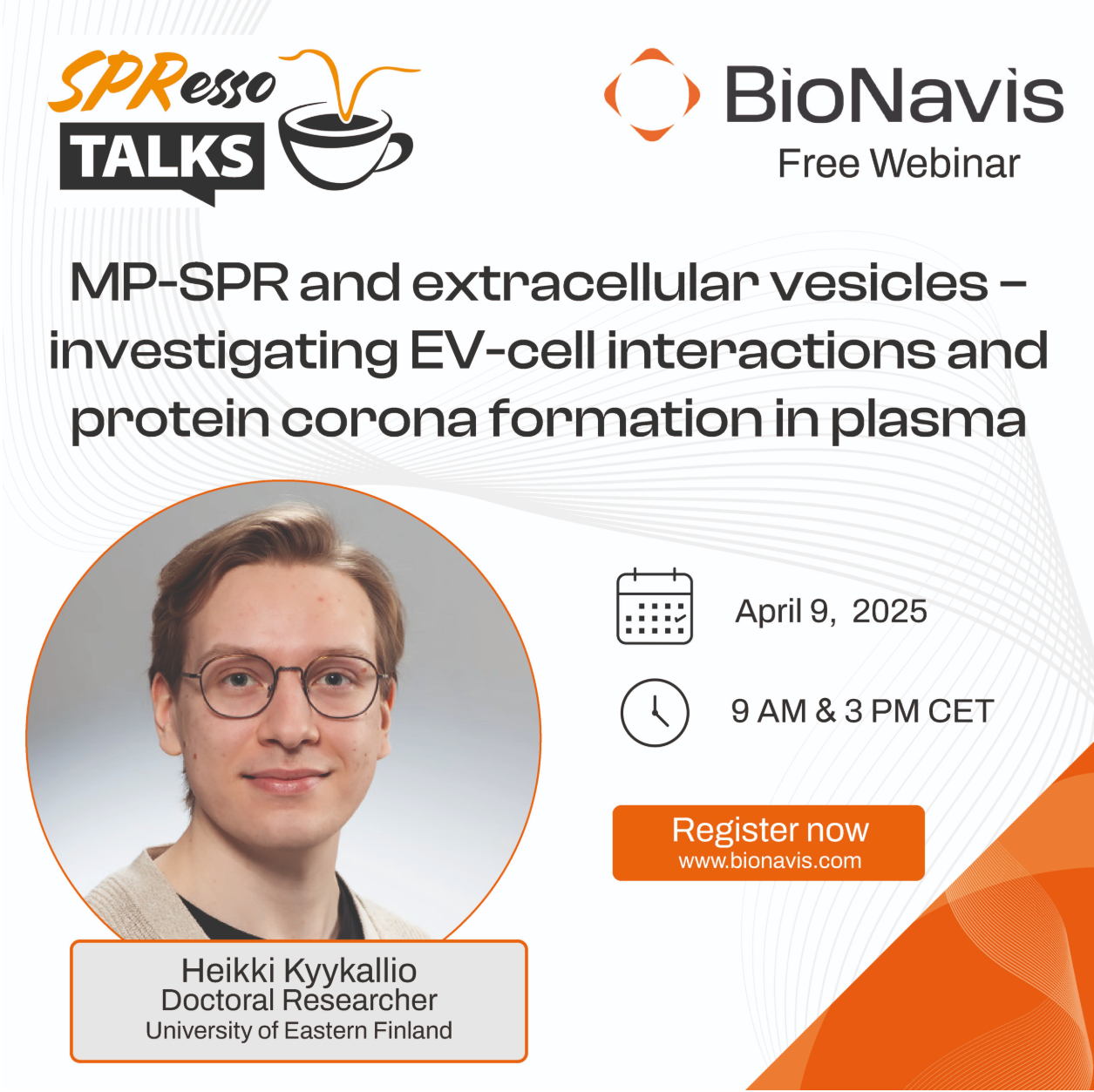 BioNavis非常高興能邀請到博士研究員Heikki Kyykallio來分享他在利用MP-SPR(多參數(shù)表面等離子體共振)以無標記方式研究 EV(細胞外囊泡)相互作用方面的最新研究成果。他將展示如何利用MP-SPR來捕獲和表征EV的亞群,研究透明質(zhì)酸表面修飾對細胞相互作用的影響,并揭示這些修飾如何影響血漿中的蛋白質(zhì)冠形成。和我們一起來探索MP-SPR如何推進細胞外囊泡的研究。