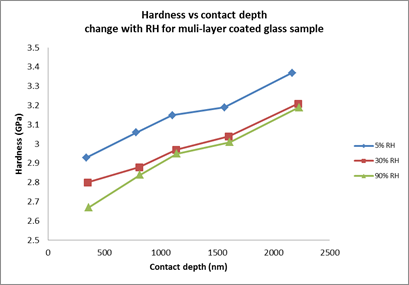 圖2表明濕度的影響并不總是可預(yù)測(cè)的。多層鍍膜玻璃樣品從5% RH增加到30% RH變化明顯,但RH進(jìn)一步增加時(shí)影響不大。與30% RH相比,即使在90% RH下硬度的下降也可以忽略不計(jì)。諸如此類的結(jié)果強(qiáng)調(diào)了在正確的濕度水平下進(jìn)行測(cè)試的重要性,而不是依靠線性外推。