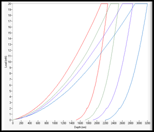 圖左所示的結(jié)果表明,變化的濕度能對(duì)高分子材料的性能產(chǎn)生影響。在這項(xiàng)實(shí)驗(yàn)中,接觸深度隨著濕度的增加而顯著增加,如果沒有進(jìn)行深刻的相關(guān)測(cè)試,可能會(huì)忽略這一影響。在峰值載荷下60秒的深度增加也很明顯,說明材料的蠕變更大。體積小和濕度變化快速是非常重要的,它們是允許研究動(dòng)力學(xué)吸濕過程的決定性因素。NanoTest加載頭的負(fù)載范圍很廣,可借助于相同的加載頭下產(chǎn)生非常淺和非常深的壓痕來研究這些擴(kuò)散過程的動(dòng)力學(xué)。