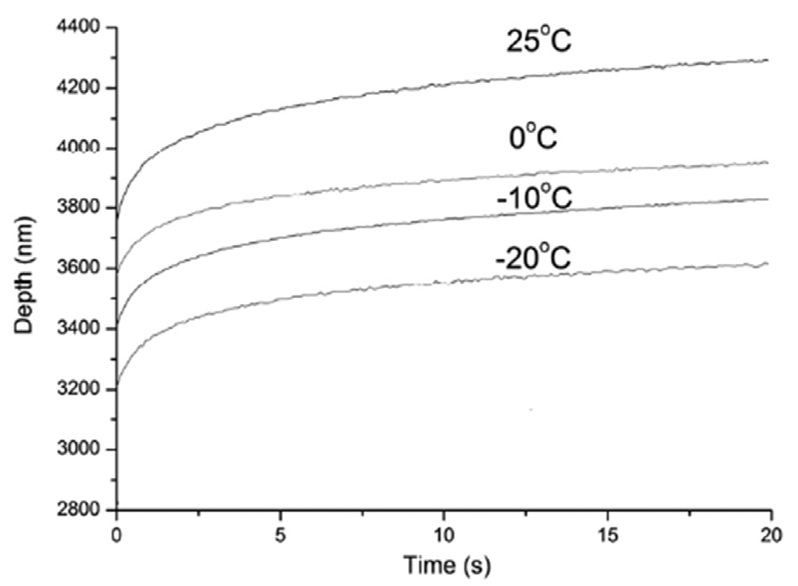 低溫對聚合物薄膜蠕變行為的影響是聚合物研究的一個重要領(lǐng)域。MicroMaterials低溫樣品臺使用業(yè)界領(lǐng)先的NanoTest熱穩(wěn)定性進(jìn)行研究。這種穩(wěn)定性可以從未經(jīng)處理的數(shù)據(jù)中直接評估蠕變行為,即使在最低溫度下,也能保持在峰值負(fù)荷。圖2展示了一個蠕變試驗的例子:隨著溫度降低,由于樣品黏彈性行為的降低,在峰值載荷下的蠕變速率也隨之減小。