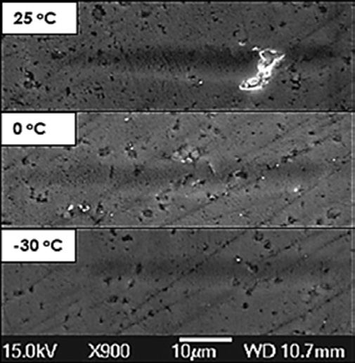 通過結(jié)合NanoTest的低溫樣品臺和劃痕測試功能可以直接評估材料的磨損行為。如圖3所示,在不同溫度下對復(fù)合DLC涂層進(jìn)行了斜載荷劃痕測試:隨著樣品冷卻,從表面去除的材料體積減小,在亞環(huán)境溫度下,磨損軌跡明顯比在室溫下淺。這種涂層在較低的溫度下也更耐開裂,這表明該DLC涂層通常用于提高耐磨性,在亞環(huán)境條件下表現(xiàn)更好。這項結(jié)論可以提高這些涂層在汽車應(yīng)用中的實用性。